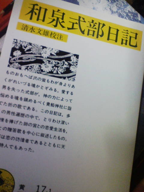 「和泉式部日記」を入浴しながら読んでいます。原文は流石に難しいので、現代語訳が同時に掲載してある初心者向けの「和泉式部日記」です。勿論、手許には原文の岩波文庫も置いています。まだ、初めの数ページですのでなんとも言うことはないのですが、和泉式部と亡き為尊(ためたか)親王とその弟の敦道(あつみち)親王との物語。主に、歌(短歌)のやりとりで話がすすむ。雅?今から思えば「雅」? しかし、当時はそれが当たり前。読了は先になりそう。岩波文庫版
