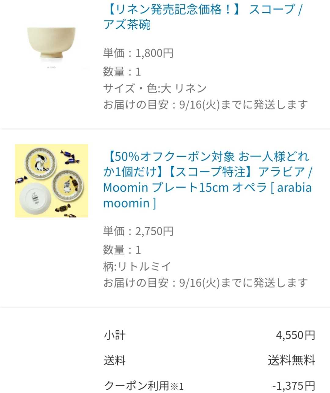 5店舗目、半額のムーミンプレートとアズ茶碗をポチ。今回は夫アカウントで参加していますが、私のアカウントでもポチ。リトルミイは私がポチして、夫アカウントではムーミンをポチ。【リネン発売記念価格!】 スコープ / アズ茶碗【50%オフクーポン対象 お一人様どれか1個だけ】【スコープ特注】アラビア / Moomin プレート15cm オペラ [ arabia moomin ]