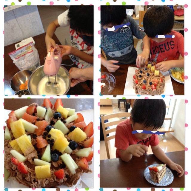 土日でケーキ作りました(≧∇≦) 先週、次男に「次はケーキね♪」と言われててσ(^_^;) 本日から臨月の私。 正直、お腹の張りも足の浮腫みも辛くてしんどかったけど、なんとか二日にまたいで頑張りました(≧∇≦) 土曜日にスポンジケーキ作り。 卵白が泡立っていくのが面白かったようです。 日曜日にホイップ作り。 途中、足らなくなって追加で作ろうとしたらチョコレートが足らなくて最初のと色が違うし(^◇^;) デコレーションは兄弟任せにしたので賑やかな事になりました(笑) みんなで美味しく食べました♪( ´▽`) スポンジがフワッフワでウマウマでした☆ 長男はあのね帳に書いて、なんと8ページ位の大作になったそうな(笑) 4ページでよかったんだけどね(笑) 臨月でこんなケーキ食べて………体重やばいな Σ(゚д゚lll)