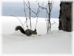 エゾリスが職場によく遊びにきます。カラマツがたくさんあるからか、木の実を一生懸命食べています。最近は、2匹現れます。親子か夫婦か友達か・・・不明ですが、ぜひぜひ住み着いて欲しいものです。まだ冬毛らしく、フサフサの耳がピーンと立って、しっぽもふわふわ♪エゾリスって、やっぱりかわいい!