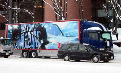 青森で撮ったツアートラックの写真です。青森市文化会館前に、写真が撮れるようにしばらく止まっていたトラック。このトラックはナンバーが 111 で、グッズ用です。 こちらはナンバー 178。 さっきの 111 の後ろ姿と比べてみてください。違いが分かりますか? (形状の違いではなく)111 の方はツアーロゴの下に 「OFFICIAL MERCHANDISE」 と入っているんです。過去のツアートラックの写真をチェックしてみましたが、こういう文字が入っているトラックは見当たりませんでした。178 のトラックは荷台の調子が悪かったのか、車庫に入れる前に止まって後ろを開けたり、ちょっとたたいたり(^^;)、していました。 ここは会館横の路地で、最初、写真を撮っていたのは私1人だったんですが、このあたりで後方から 「178だ!」 という声が聞こえてきて(^^;)、ほかの人が続々とやってきました。車庫入れこの写真の左に車庫があります。 狭い路地で、しかも雪道で、この大きなトラックを狭い車庫に入れる。大型の運転手さんはさすがです。
