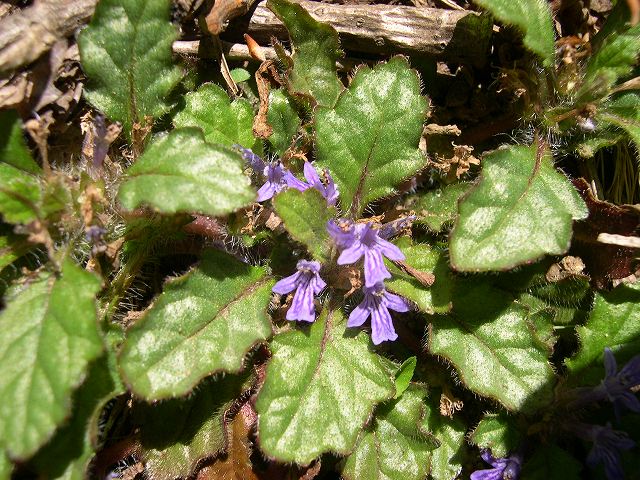 ★キランソウ 遅野沢地区でキランソウが咲いていました。キランソウはシソ科の植物で本州、四国、九州に分布します。野原や道ばたに生える多年草で、茎は地面をはって広がり、直立しません。花冠は長さ1cmくらいの唇形で濃紫色です。開花時期は3~5月です。和名は金瘡小草(きらんそう)です。蘭のような紫色の花なので「紫蘭草」が転訛して「キランソウ」になったとの説があります。