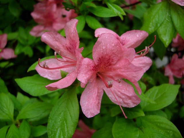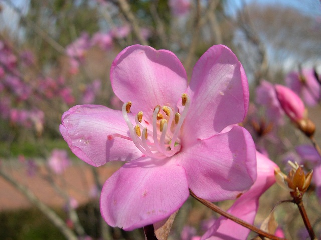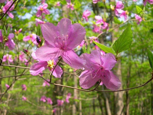 ★アカヤシオ 上塩原地区でアカヤシオが咲いていました。アカヤシオはツツジ科の植物で本州(福島県~兵庫県)に分布します。山地に生える落葉低木で、高さ5~6mになります。花は径3~4cmで淡紅色です。開花時期は4~5月です。和名は赤八染(あかやしお)です。栃木県の県花です。