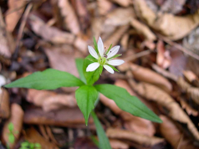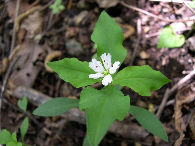 ★ワチガイソウ 遅野沢地区でワチガイソウが咲いていました。ワチガイソウはナデシコ科の植物で本州(中部地方以北)、九州(北部)に分布します。山地の草の間などに生える小形の多年草で、茎は高さ8~20cmになります。花は径8mmくらいで白色、葯は紫色です。開花時期は4~6月です。和名は輪違草(わちがいそう)です。ワチガイソウの語源は牧野富太郎博士によれば、その名前が不明であった頃、鉢に“輪違い”のラベルを差しておいたのがそのまま和名になったといわれます。