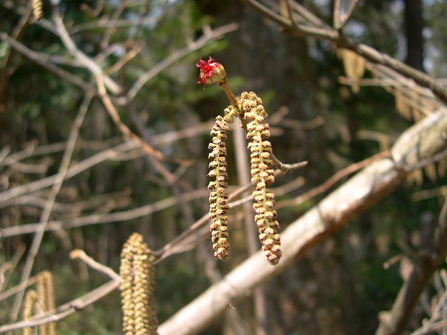 ★ツノハシバミ 蟇沼(ひきぬま)地区でツノハシバミが咲いていました。ツノハシバミはカバノキ科の植物で北海道、本州、四国、九州に分布します。 山地に生える落葉低木で、高さ4~5mになります。雄花序は長さ3~7cmで、枝から垂れ下がります。雌花序は数個の花が頭状に集まり、雄花序より上部につきます。堅果は長さ6~8mmで、先がくちばし状の筒になります。実は食べられます。開花時期は3~4月です。和名は角榛(つのはしばみ)です。ハシバミの語源には諸説ありますが、葉にシワが多いので「葉皺実」、「榛紫実」とする説があります。