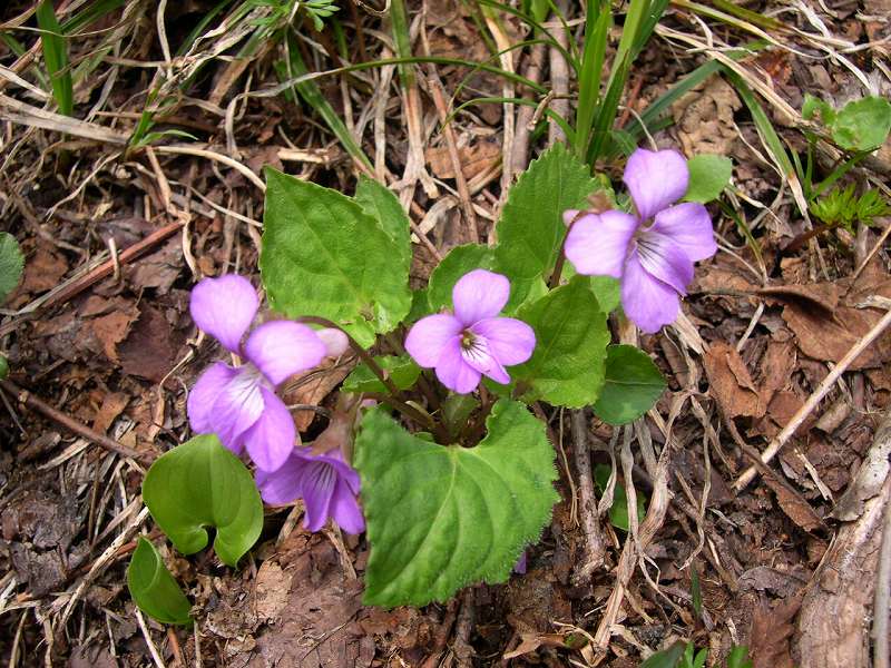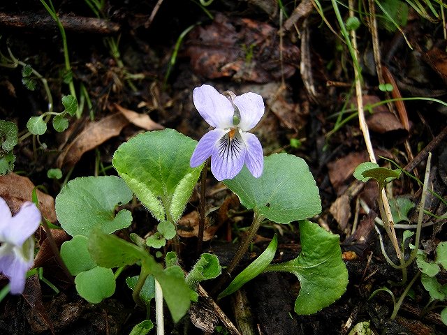 ★スミレサイシン 上塩原地区でスミレサイシンが咲いていました。スミレサイシンはスミレ科の植物で北海道、本州に分布します。山地の林下に生える多年草で、高さ12cmくらいです。花は径2~2.5cmで淡紫色です。開花時期は5~6月です。和名は菫細辛(すみれさいしん)で、葉の形がウスバサイシンに似ていることによります。細辛は根をなめると辛く、葉柄が細いことに由来します。
