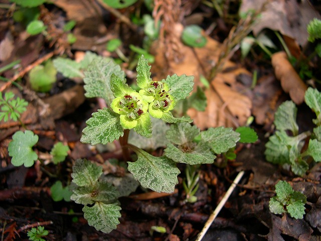 ★ヨゴレネコノメ 遅野沢地区でヨゴレネコノメが咲いていました。ヨゴレネコノメはユキノシタ科の植物で本州(関東地方以西の太平洋側)、四国、九州に分布します。低山の沢沿いの湿地に生える多年草で、茎は高さ10~20cmになります。花は中心にある暗紅色の部分で、黄色い部分は葉です。萼片は花のころにも平開せず、しばしば直立します。花弁はありません。雄シベは4個で、葯は暗紅色です。開花時期は3~4月です。和名は汚猫目(よごれねこのめ)で、ネコノメソウの仲間で、葉が汚れた感じであることに由来します。ネコノメの由来は果実が猫の目(瞳の形)に似ているからという説と、咲いた花の先端が猫の目に似ていからという説があります。
