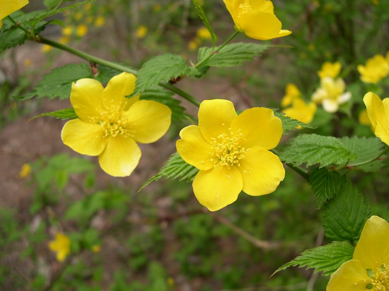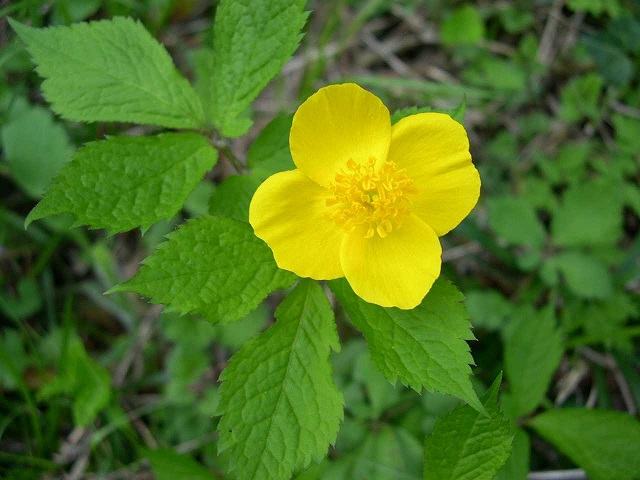 ★ヤマブキ 井口地区でヤマブキが咲いていました。ヤマブキはバラ科の植物で北海道、本州、四国、九州に分布します。山地の湿ったところに生え、高さ1~2mになります。花は径3~5cmで鮮黄色です。開花時期は4~5月です。和名は山吹(やまぶき)で、ヤマブキの枝がそよ風に揺れるようすを表わす「山振り(やまぶり)」に由来します。