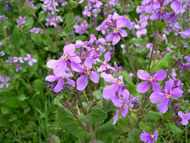 ★オオアラセイトウ 自宅近くでオオアラセイトウが咲いていました。オオアラセイトウは中国原産の帰化植物です。野原や空き地に生える越年草で、茎は高さ10~50cmになります。花は径2~3cmで、紅紫色または淡紫色です。開花時期は3~5月です。和名は大紫羅欄花(おおあらせいとう)です。名付け親は牧野富太郎博士で、紫羅欄花(アラセイトウ=ストック)より大きいのでオオアラセイトウと名付けられました。