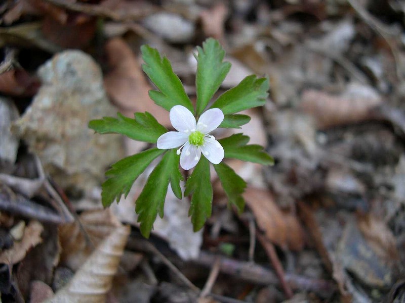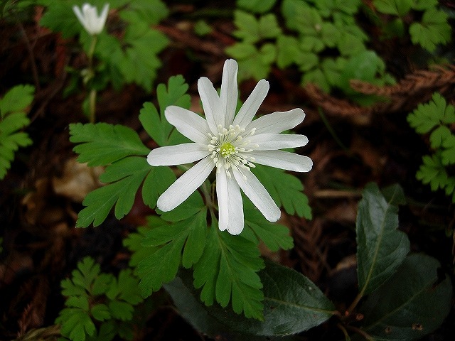 ★キクザキイチリンソウ 遅野沢地区でキクザキイチリンソウが咲いていました。山地の林の中などに生える多年草で、高さ10~20cmになります。花は径2.5~3cmで白色、ときに淡紫色のものもあります。開花時期は3~5月です。和名は菊咲一輪草(きくざきいちりんそう)です。花が菊に似て、ひとつの茎に一輪だけ花が咲くことに由来します。別名をキクザキイチゲ(菊咲一華)といいます。