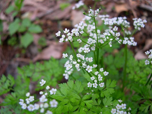 ★セントウソウ 遅野沢地区でセントウソウが咲いていました。セントウソウはセリ科の植物で北海道、本州、四国、九州に分布します。山野の木陰に生える多年草で、高さは10~35cmになります。花は径2mmくらいで白色です。開花時期は4~5月です。和名は仙洞草(せんとうそう)です。人里離れた仙人の住いを「仙洞」といい、そのようなところに自生しているからという説があります。