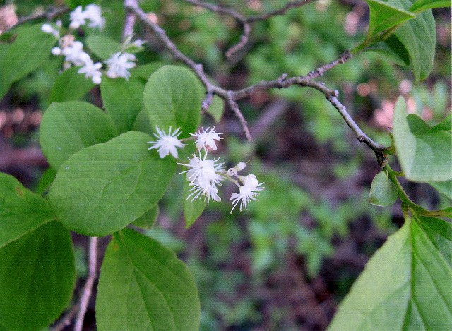 ★サワフタギ 井口地区でサワフタギが咲いていました。サワフタギはハイノキ科の植物で北海道、本州、四国、九州に分布します。山野に生える落葉低木~小高木で、高さ4~6mになります。花は径7~8mmで白色です。果実は長さ6~7mmのゆがんだ卵形で藍色に熟します。開花時期は5~6月です。和名は沢蓋木(さわふたぎ)です。幹の下の方から細かく枝分かれして、横に広がる性質があるので、沢に蓋をするようにして生える木という意味です。