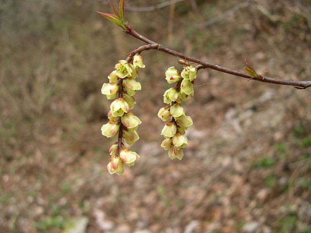★キブシ 遅野沢地区でキブシが咲いていました。キブシはキブシ科の植物で本州(福島・新潟県以西)、四国、九州に分布します。山地に生える落葉低木で、高さ3~5mになります。花は長さ約7mmの鐘形で黄色です。雌雄異株で、一般に雄花は黄色みが強く、雌花は緑色を帯ます。開花時期は3~4月です。和名は木五倍子(きぶし)で、果実に含まれるタンニンが、黒色染料の五倍子(ぶし)の代用になることに由来します。