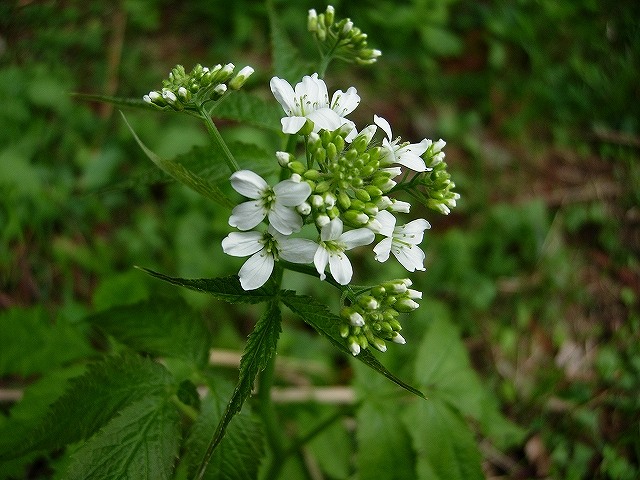 ★コンロンソウ 遅野沢地区でコンロンソウが咲いていました。コンロンソウはアブラナ科の植物で北海道、本州、四国、九州に分布します。山地や谷川沿いの半日陰の湿り気のあるところに生える多年草で、茎は高さ20~70cmになります。花は径7~10mmで白色です。開花時期は4~7月です。和名は崑崙草(こんろんそう)で、花の白さを中国の崑崙山の雪にたとえたものといわれています。