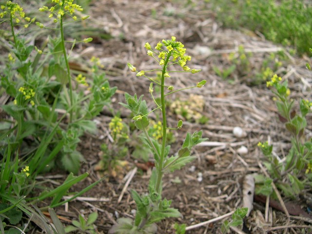 ★イヌナズナ 自宅近くでイヌナズナが咲いていました。イヌナズナはアブラナ科の植物で北海道、本州、四国、九州に分布します。畑や野原に生える越年草で、茎は高さ10~20cmになります。花は小さな十字状花で黄色です。開花時期は3~6月です。和名は犬薺(いぬなずな)で、同じナズナ属のナズナに似ているが、食用にならないことに由来します。