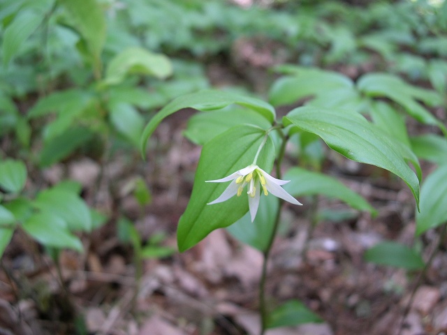 ★チゴユリ 井口地区でチゴユリが咲いていました。チゴユリはユリ科の植物で北海道、本州、四国、九州に分布します。山地のやや明るい林内に生える多年草で、茎は高さ15~30cmになります。花は径1.5cmくらいで白色です。和名は稚児百合(ちごゆり)で、かれんで小形の花のようすに由来します。