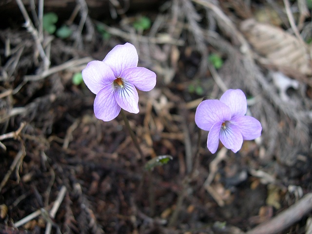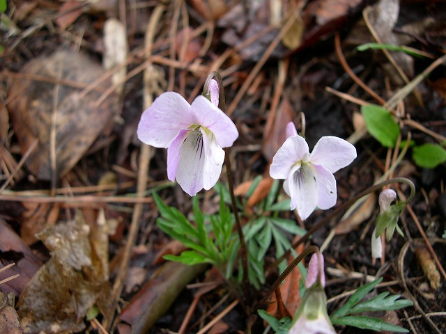 ★アオイスミレ 遅野沢地区でアオイスミレが咲いていました。アオイスミレはスミレ科の植物で北海道、本州、四国、九州に分布します。山野の湿り気の多いところに生える多年草です。花は径約1.5cmで淡紫色または白色です。開花時期は3~4月です。和名は葵菫(あおいすみれ)で、葉がフタバアオイに似ていることに由来します。スミレの中では比較的早く咲きます。スミレの語源は昔の大工用具「墨入れ」に由来し、距を墨入れに見たてたものとされます。
