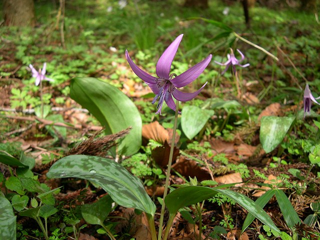 ★カタクリ 遅野沢地区でカタクリが咲いていました。カタクリはユリ科の植物で北海道、本州、四国、九州に分布します。山野に群生する多年草で、茎は高さ15cmくらいです。花は径4~5cmで、紅紫色です。リン茎から昔はカタクリ粉を取りました。朝日が昇り気温が上昇すると開花し、温度が下がったり、夜間は花を閉じます。地表付近の温度が13度を越えないと日中でも開花しません。開花時期は3~5月です。和名は片栗(かたくり)で、食用にする鱗片が栗の片割れに似ていることに由来します。