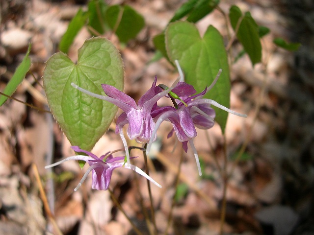 ★イカリソウ 遅野沢地区でイカリソウが咲いていました。イカリソウはメギ科の植物で北海道、本州に分布します。山地に生える多年草で、高さ20~40cmになります。花は主に淡赤紫色で、白色の花もあります。花弁には長さ1.5~2cmの長い距(きょ)があります。開花時期は4~5月です。和名は錨草(いかりそう)で、花の姿が船のいかりに似ていりることに由来します。