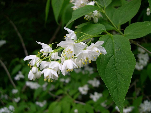★ヒメウツギ 関谷地区でヒメウツギが咲いていました。ヒメウツギはユコノシタ科の植物で本州(関東地方以西)、四国、九州に分布します。山地の岩の上などに生える落葉低木で、高さ1~1.5mになります。花は径1~1.5cmで白色です。開花時期は5~6月です。和名は姫空木(ひめうつぎ)で、小型のウツギとい意味です。ウツギは茎が中空であることに由来します。