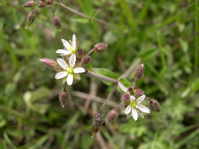 ★ミミナグサ 井口地区でミミナグサが咲いていました。ミミナグサはナデシコ科の植物で北海道、本州、四国、九州に分布します。道ばたや畑に生える1年草で、高さ15~30cmになります。花は小さく白色です。開花時期は4~6月です。和名は耳菜草(みみなぐさ)で、葉がネズミの耳に似ていて、若いときには食べられることに由来します。