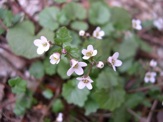 ★ユリワサビ 遅野沢地区でユリワサビが咲いていました。ユリワサビはアブラナ科の植物で北海道、本州、四国、九州に分布します。山地の谷沿いや湿気の多い森林中に生える多年草で、茎は高さ13~15cmになります。花は小さな十字状で白色です。和名は百合山葵(ゆりわさび)で、葉がワサビに似ていて、秋になると地上部は枯れますが、葉柄の基部が肥厚してユリのような鱗茎になることに由来します。