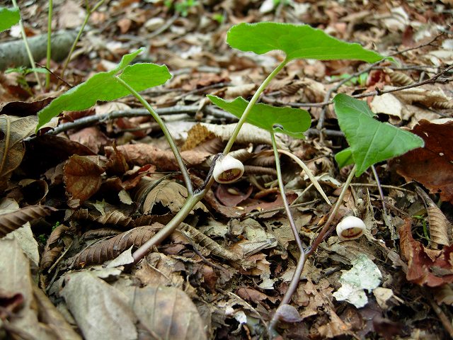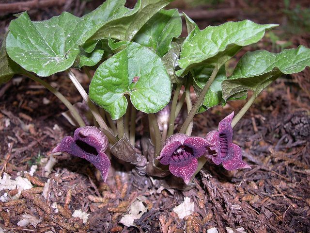 ★ウスバサイシン 遅野沢地区でウスバサイシンが咲いていました。ウスバサイシンはウマノスズクサ科の植物で本州、四国、九州に分布します。山地のやや湿った林下に生える多年草です。花は径1~1.5cmです。花びらのように見えるのは萼(がく)で、広い鐘形。先端は3裂します。開花時期は3~5月です。和名は薄葉細辛(うすばさいしん)で、根を漢方で細辛(さいしん)と呼び、鎮痛、鎮咳(ちんがい)、去痰(きょたん)に用いました。