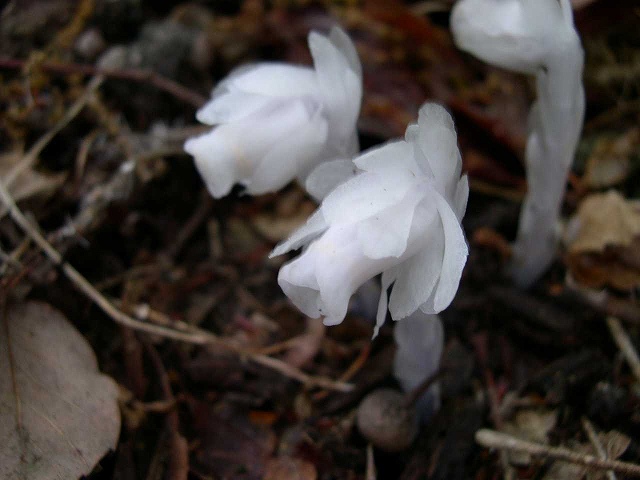 ★ギンリョウソウ 上横林地区でギンリョウソウが咲いていました。ギンリョウソウはイチヤクソウ科の植物で日本全土に分布します。山地のやや湿り気のある腐植土の上に生える多年草で、高さは8~20cmになります。緑色の葉や茎を持たず、必要な養分は根に共生する菌類からもらいます。開花時期は4~8月です。和名は銀竜草(ぎんりょうそう)で、花が下を向き、うろこ状の葉に包まれた全体の姿を、首を持ち上げた銀色の竜に見立てたものです。