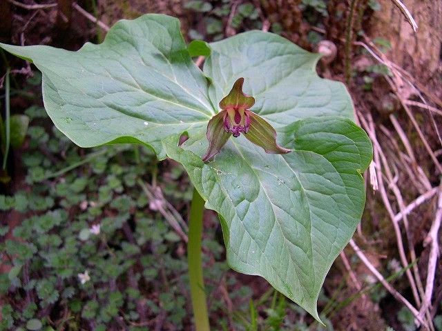 ★エンレイソウ 遅野沢地区でエンレイソウが咲いていました。エンレイソウはユリの植物で北海道、本州、四国、九州に分布します。山地のやや湿り気のある林内に生える多年草で、茎は高さ20~40cmです。外花被片は長さ1.2~2cmで緑色または褐紫色です。内花被片は普通ありません。開花時期は4~6月です。和名は延齢草(えんれいそう)で、薬草の効があり、中国で「延齢草根」という名の胃腸薬として用いられていたことに由来します。