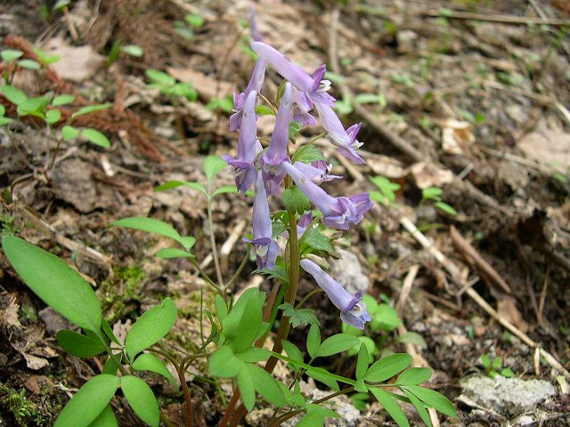 ★ヤマエンゴサク 蟇沼(ひきぬま)地区でヤマエンゴサクが咲いていました。ヤマエンゴカクはケシ科の植物で本州、四国、九州に分布します。山野の林下に生える多年草で、茎は高さ10~20cmになります。花は長さ1.5~2.5cmで青紫色または紅紫色です。開花時期は4~5月です。和名は山延胡索(やまえんごさく)で、漢方薬に使われるエンゴサクの野生種という意味です。エンゴサクは中国に生える薬草で、その塊茎を乾燥したものを「延胡索」と称し、鎮痛、鎮痙、鎮静薬としました。