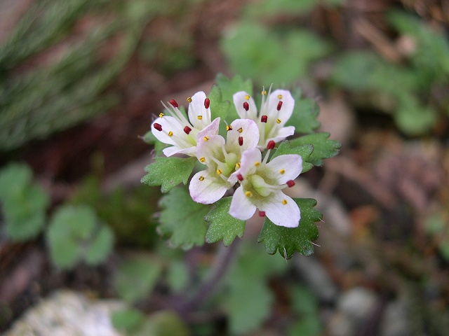 ★ハナネコノメ 遅野沢地区でハナネコノメが咲いていました。ハナネコノメはユキノシタ科の植物で本州(福島県~京都府)に分布します。山地の林の下や谷川のふちなどの陰湿地に生える多年草で、花茎は高さ5cmくらいです。花は径5mmくらいで白色、葯は暗紅紫色です。開花時期は3~5月です。和名は花猫の目(はなねこのめ)です。ネコノメの語源は果実が猫の目(瞳の形)に似ているから、ハナは花がきれいだからです。