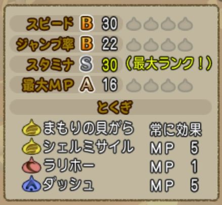 4月14日良いよ!の日しーぴょんお誕生日おめ!11月13日わんわんわん最高!の日たっきゅんお誕生日。5月53日ここみ!の日ここみちゃんお誕生日。2月5日にんGO!の日みつきちゃんお誕生日。語呂合わせで覚えておくと絶対に忘れないでごじゃーwこのページで利用している株式会社スクウェア・エニックスを代表とする共同著作者が権利を所有する画像の転載・配布は禁止いたします。(C) ARMOR PROJECT/BIRD STUDIO/SQUARE ENIX All Rights Reserved.ひゃああw100万ゴールドげっとしてからじゃないとキモチ良くスライムレース楽しめない守銭奴なのおおw100万ゴールド×5キャラ=500万ゴールドげっと確定してキモチ良くなれたのでみんなにキモチ良くスライムレース攻略法を伝授できるでごじゃーwふえっ!3時間以上スライムレースやってるのに50万ポイントと60万ポイント行ったり来たりして一生100万ポイント到達できる気しないよお!なんて鈍足スラガメちゃんたちにとっておきの攻略法を教えておくでごじゃー!結論から言ってしまうとスライムつむりちゃんでスピードBジャンプ率BスタミナS最大MPがAのBBSA型作戦はシェルミサイルシェルミサイルシェルミサイルラリホーにしたら本選から30分で100万ポイント達成できるでごじゃーwとくぎはまもりの貝がらシェルミサイルラリホーを覚えておいてほしいでごじゃー。残る1つのとくぎは使わないので何でもいいでごじゃー。なぜBBSA型作戦はシェルミサイルシェルミサイルシェルミサイルラリホースライムつむりちゃんが強いのか理由。シェルミサイルは攻撃と防御が1つになった攻防一体型スキルだから強いでごじゃー!スライムちゃんたちは大きく分けて攻撃スキルと防御スキルと自己強化スキルを持ってるでごじゃー。それぞれのスキルを使った場合自分と相手の勝ち負けはこうなるでごじゃー。自分が攻撃スキルを使って相手が攻撃スキルを使った場合引き分け。相手が防御スキルを使った場合引き分け。相手が自己強化スキルを使った場合勝ち。1勝2分け。自分が防御スキルを使って相手が攻撃スキルを使った場合引き分け。相手が防御スキルを使った場合引き分け。相手が自己強化スキルを使った場合負け。1敗2分け。自分が自己強化スキルを使って相手が攻撃スキルを使った場合負け。相手が防御スキルを使った場合勝ち。相手が自己強化スキルを使った場合引き分け。1勝1敗1分け。自分が攻防一体型スキルを使って相手が攻撃スキルを使った場合勝ち。相手が防御スキルを使った場合引き分け。相手が自己強化スキルを使った場合勝ち。2勝1分け。自分が攻防一体型スキルを使った場合が一番勝率が高いでごじゃー!攻防一体型スキルは1ターンで2つの効果がある二刀流スキル!同じ理由で防御と自己強化が一体になった二刀流スキルジャンプの構えを持ってるスライムタワーちゃんも強いでごじゃー。つぎちゃんはだんごより貝が食べたかったのでスライムつむりちゃんにしました!それでは今日の日記はここまで。つぎの日記でお会いするでごじゃる。にんにん♪