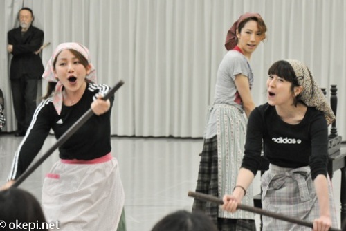 結婚に憧れてうっとりしながら花嫁さんのベールを破ってしまったジュリア役の愛ちゃん。さらには新郎新婦の記念撮影にも入ってしまい周りの人が茫然としているシーンの稽古中です・・・。