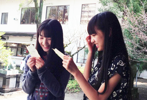 お参りの後におみくじを引いたさゆみんとはるなん。笑顔のさゆみんとひきつった表情のはるなんが好対照ですね・・・(笑)。