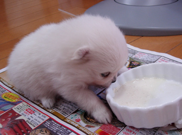 くるみの子犬ちゃん、生後30日目になりました! 一人っ子なので、のんびりおっとり過ごしています。 食事前・・・ ↓ 食後・・・顔中、ミルクだらけ。 手にもミルクが。(*≧m≦*)ププッ すくすく成長しています。(^^) 今日の体重:409g ※飼い主さんを募集する予定でいるけれど、あまりにかわいいので、家に残すかも・・・。(^^ゞ