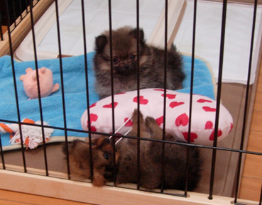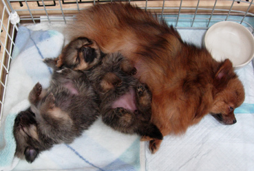 産箱の中でのツーショットを撮ろうと思ったけれど、 なかなか同時にこちらを見てくれませんでした。(^-^; 顔をなめあう親子♪ だいぶポメラニアンらしくなりました。(^^) さすがのくるみも、だいぶ余裕が出てきたのか、 暇になってきたのか、子犬が寝たら産箱から出てくるように なりました。 子犬も、目覚めたら新聞紙の方へ移動してトイレをしているので そろそろ産箱を撤去して、サークルにしようと思っています。 やっと写真が撮りやすくなります♪ ※今日は体重を量っていなかったので、 昨日の体重(生後37日目):458g