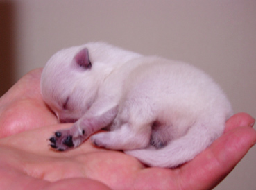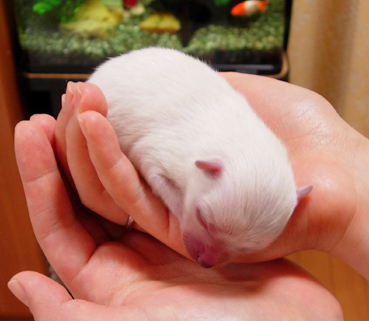 ダンナの手の上の子犬ちゃん♪ コロンって寝転がっているところです。 だんだん毛が伸びてきました。 前回の写真、5日前と比べても、違いがはっきり。 だいぶ子犬っぽくなりました。(^^) 目が二重瞼っぽく見えるけれど、白いまつげです。白いまつげが目にかぶさって見えるので、眠たそうなお顔に見えます。子犬ちゃんのお顔、角度によっては 正面から見たウーパールーパーにも見える・・・。(*≧m≦*)ププッ 最近は、ヨチヨチ歩いて、コロンって転がったり、くるみについていって、産箱から脱走していたりします。(^-^;