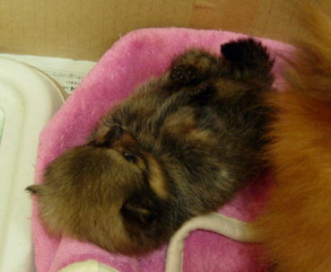 とっても久しぶりの日記です。(^-^;10月25日に、小梅の子犬が産まれました!現在、生後25日で、まるまると成長中です。待望の北斗との子犬で、女の子が1匹です。写真は、ダンナが持ってくれているのですが、良く見たら、舌チロしています。(*≧m≦*)ププッ実は今回の小梅の出産は、産まれるまでずっと不安でした。今年の春のことが頭から離れなかったのもあるけれど、小梅は胴が太いので、お腹に赤ちゃんが1匹だと、胎動もわかりづらく、お腹もあまり大きくならなかったので(もともと小梅の自腹が大きいので・・・。)本当にお腹の赤ちゃんが元気にしているのか、不安な日々でした。でも、とっても安産で、元気に産まれてきてくれて、本当に良かったです。今年の出産は、これで終わりです。子犬はこの子1匹だけなので、のんびり子犬育てを楽しみたいと思っています。(^^ゞ生後1週間ぐらいの時の子犬ちゃん。