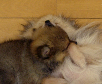 お乳をあげながら寝てしまったくるみと、 お乳を飲みながら、寝てしまった子犬。(*≧m≦*)ププッ お乳をくわえたまま寝てるんですよ~。 かわいいです♪くるみもお世話にだいぶ余裕が出てきました。もう安心です。(^^)