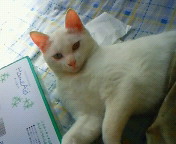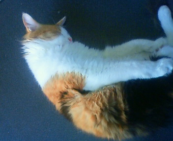 こたつから上半身だけ出して、仲良く行き倒れ状態の白猫兄妹。たぶん・・・左がちろる(♀)で右が千代助(♂)???その頃のどりあ。これはこれでなんか変なポーズ。
