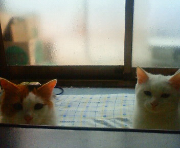 いつも二階に無理矢理詰まっている白猫兄妹。はみ出す程ギュウギュウに詰まってなくても、一階もキャットタワーも空いてるのに・・・。