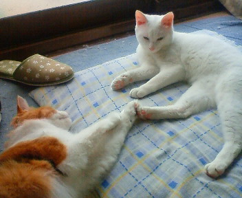 どりあ(三毛)vs千代助(白・♂)。最近ちよも大きくなってきて、どりお姉ちゃんが倒される事も。でも、大抵はちろ&ちよよりもお姉ちゃんの方が優勢。・・・と思ったら、あっさり休戦。短い戦いだった。