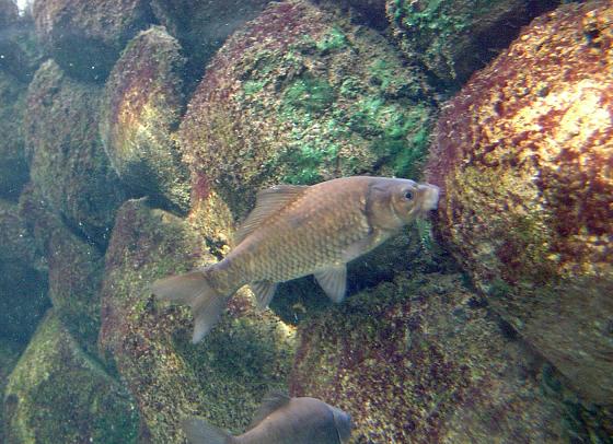 次は中流部。実は今回フナの写真を撮っていこうと思っていたのでシャッターチャンスを狙う。でもやっぱり写真は苦手だ。でかい水槽にフナ類がいっぱい泳いでいたが、良いタイミングになるとコイが現れて邪魔をしてくれる。ようやく撮ったのが下の写真。展示の案内にはギンブナと書かれていたが、見た感じはオオキンブナに見える。