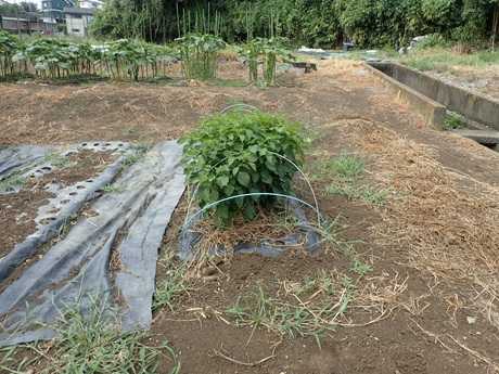 (こぼれ種から発芽した青シソ苗植え付け地)