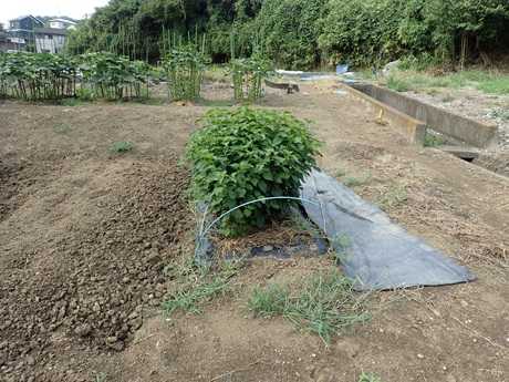 (こぼれ種から発芽した青シソ苗植え付け地)