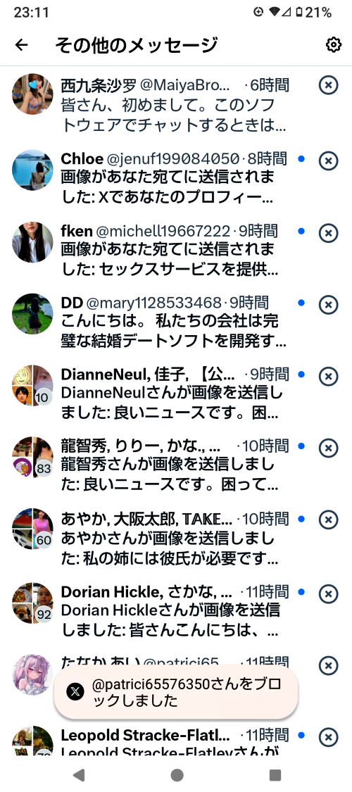 Twitterでグループに入れられても通知が来ないんでDM開かないとわからないことがあるDMってそもそも来ないし…知ってる人から(フォローしてる)なら通知は来るんだけどね知らない間にたくさんのグループに入ってたよこれから調理します♪ 知らない間にめちゃくちゃたまっていましたまぁ普通の人なら削除していくだけなんでしょうけどちょっと遊んでみましょう宇宙の画像をDLします宇宙ねこバージョンでもやってみたよ 編集で画像と グループ名を変更しますいろいろ楽しいこと書いて~一番下の会話を削除退出でOK私が「名前を変えました」って出るくらいで特にリンクもないから大丈夫です(変えて脱退した人もよくいてるから) この日は時間があったのでサクサクと100件くらい?さかのぼったら6月くらいまであったんでびっくりしつつ名前変えて 画像変えて脱退削除していきました「突然のスパム失礼します」wwwだいたいは下着のみのおねーさんのアイコンとラインIDが貼られている感じかなだまされる人もいてないとは思うけどこういうのは詐欺につながるので消してしまいましょうってことです名前考えるの楽しかったなもういまDM送ってこれる人はフォローしている人だけにしたから来なくなりました解決♪(*´∇`)ノシ