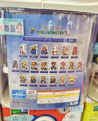 ネットのお知らせで見たファイナルファンタジー ピクセルリマスターアクリルスタンド 400円ガチャ何軒目かで発見できました私の中ではチョコボがあたりかな おいおいエドガーこい こいって願ってたらバッツが来てくれました(FF5)隣にうっすら白い物体白ピクミンですね透明ですけどピクミンの目印アクセサリーは半透明なんですよね右にも青ピクミンいてますね2.5センチくらいかなすぐになくしそうな予感しかしないアクリルスタンドだけど台座がないパターン厚みがちょっとあるから自立はするよこれは1個でいいかなまぁ知ってるキャラが来たのでよしとしましょう(*´∇`)ノシ