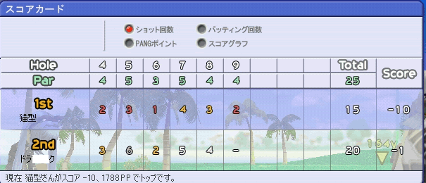 あんまり書く事がないので少しネトゲーネタでも。RFから・・・レベル41まであげてスキルも上級まで使えるようになりました。しかし・・・コラ強すぎてお話になりませんよ(´ー`)y━~~んで来月は99%課金はしない予定っす。次はパンヤ新しいコースが実装されましたねぇ。感想はと言うと星一つなんで簡単なコースってのはわかってたんですが実際やってみた感想は・・・マジで簡単(´ー`)y━~~二回ほど大会で回って後は対戦で少しやっただけなんですがスコアは-20止まりでした。ミスさえなければ・・・w管理人的には出せるだろうと思うスコアは-26ぐらいでしょうか。チップ狙うポイントがまだあんまりわかっていないのでポイントさえわかればもっとスコア伸びるかもしれませんね。ただ・・・ミスが痛いミスせずに18H回れる事の方が少ないですからねぇ・・・これ以上書く事思いつかないので、今日は終わり|彡サッ!