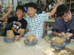 朝から王子のクラスレクレーションで大村にある「三彩の里」へ行って来ました6年ともなるとクラブ活動やらナンやらで全員が集まるのは至難の業女子6人欠席、それでも男子は全員集合 w(゜o゜)w オォーワイワイ盛り上がりながら陶芸教室粘土の玉を貰い 紐練りで製作かたちを作っていきましたほぼ完成した王子 (o^v^o)姫も2作品を作り終わり 3作品目を作成素焼きや絵付けの行程もやりたいけど今回はかたち作りのみ後の行程は三彩の里の人たちがやってくれて来月に届けて貰えるようですあ~~ぁ 割れないといいなぁ・・・・・