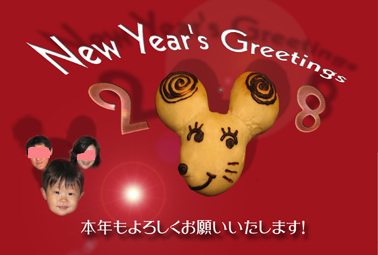 あけましておめでとうございます私と夫のコラボの年賀状。ねずみはパン!ラフランス酵母です。今回は意外にシンプル。今年縁起が良い(らしい・・・夫曰く)色を使ったところがポイント(らしい)そして、注目は私達の顔の合体の影もねずみってところ(らしい)毎年二人で案を出し合い、何パターンか試し作りをして良いものを採用してますが、今年は夫の案が採用されました。去年その前は私の案が採用。年によってはどっちも譲らずで、二種類年賀状ができあがることもあります。そしてこんな年賀状出した後で、去年のパン。31日の朝用に作ったのはクイックヨーグルト酵母で“チーズケーキパン”クリームチーズクリームを乗せて焼くパン。まーくんに「何が食べたい?」って聞いたら「丸パン!メロンパンがいいなー」って。でもクッキー生地用意してないしなー。ってことでこちらになりました。まーくんは「メロンパンうれしー」って食べてましたよ。ふわふわ生地にほのかな甘みと酸味のこのチーズケーキパン。おいしいわー。メロンパンよりあっさりしているから甘すぎるのが苦手な人にもいいかも。クリームチーズ大好きな私にもいいかも。去年の3月始めたブログ、みなさんのブログに影響されコメントの支えられいろんなことに挑戦できた年でした。今年もさらに楽しめ、楽しんでもらえるように続けていければなーって、思っています。本年もよろしくお願いします